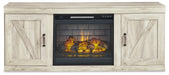 Details Includes TV stand, bridge, 2 piers and fireplace insert, Made of engineered wood (MDF/particleboard) and decorative laminate, Wispy white finish over replicated oak grain with authentic touch, One open storage area and 2 single-door storage areas (each with adjustable/removable shelf), Cutouts for wire management and ventilation, Electric fireplace insert provides up to 5,386 BTU/1,500W and warms up to 1,000 square feet (heats larger rooms), 7-level temperature setting; 5 levels of flame brightness, LED-lit multi flame display operates with or without infrared heat, Realistic-looking log set with dynamic glowing embers, Remote control with LED display, Timer function with programmable ranges from 10 minutes to 9 hours; overheating control device, Power cord included; UL Listed, Assembly required; simply remove the center shelf and back panel to make room for the fireplace insert