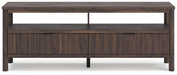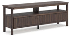 Crafted with both form and function in mind, this TV stand brings a dash of retro-cool character to your modern boho aesthetic. A reeded design on its drawers adds an on-trend touch to storing entertainment essentials. Warmly welcoming with a rich brown finish, the TV stand pairs well with muted hues, earth tones and other neutrals alike. And for added ambiance, lighting under the top brings a cool vibe to your favorite shows or video gaming. What a refined take on easygoing style.