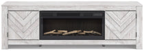 This TV stand with electric fireplace embraces a classically charming aesthetic and repurposes it for modern living. Its whitewash replicated paint appeals to your love of vintage character, while the chic chevron pattern is effortlessly on trend. Media accessories stay tucked away in style thanks to hidden storage behind the doors. And for added ambiance, the electric fireplace brings a cozy-cool vibe to your living room. With the touch of a button, activate the LED-lit flame and adjust the temperature or the flame brightness. The flame effect includes multiple color options and a realistic-looking faux birch log set.