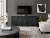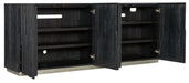 Pine Veneers in a Charred Black finish featuring a Japanese technique to achieve the look of burnt wood create a truly unique piece in the Chapman Entertainment Console. Modern yet warm, and up-to-date while employing an ancient technique, this entertainment center is focal-point worthy while offering 4 doors with soft-close hinges and touch latches, 2 adjustable wood shelves behind each pair of doors, a ventilated back panel and a power supply. Accommodates up to an 80-inch TV.