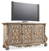 Elevate your entertainment in livable luxury. The timeless Chatelet Entertainment Console features 3 mirrored fretwork doors, a scalloped base and the soft amber Caramel Froth finish. The accent finish is Paris Vintage, a distressed white with fretwork overlay. The antique mirror behind the fretwork is removable. Behind each door are two adjustable shelves. One three-plug outlet. Accommodates up to a 65-inch TV.