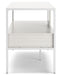 | Details | Made with engineered wood and melamine laminate, Replicated pickled white oak wood grain, MEGA-TUFF® melamine surfaces are made of easy-clean melamine which is heat-, scratch-, water- and stain-resistant, Tubular metal frame with white powder coated finish, Goldtone hardware, Open shelf, 2 storage drawers, Assembly required | |
