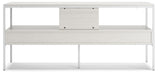 Bring your vision of a modern living room to life with this sleekly designed TV stand. Its linear construction and white finish keep things minimal. An open shelf and two drawers allow you to store in simply streamlined style, rounding out this versatile, striking piece.