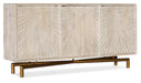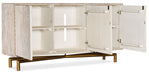 Exuding a resort feeling, this Entertainment Console pairs a creamy neutral rustic light wood finish with antique bronze metal finger pulls and a metal base. Crafted of Mango Wood and iron, there’s one removable shelf behind each door and a ventilated back panel. Accommodates a 70-inch TV.