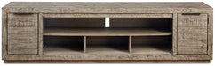 This extra-large TV stand is sure to win your heart with its daring take on modern rustic expression. Its crisp, clean minimalist-chic profile is enriched with striking pine wood grain and a weathered gray finish with distressed saw mark texture. Designed to turn your home theatre room into a style statement, the large center media cabinet can be removed for use with the optional W100-22 electric fireplace (sold separately).