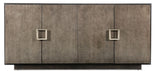 Crafted of Figured Primavera Veneers with a Canvas Crackle finish, the Asher Entertainment Credenza has a tactile, tasteful appeal. Soft, casual and modern, the silhouette has 4 doors with soft-close hinges and magnetic door catches with one adjustable shelf behind and one drawer behind each pair of doors. Accommodating up to a 75-inch TV, the credenza has a vented back panel and power supply behind the right side doors. A plinth base and champagne-colored buckle pulls add a sleek touch.