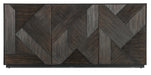 Tranquil and modern with a tropical retreat-inspired vibe, the Retreat Entertainment Center has a striking carved wave motif on the door fronts. Crafted of Oak Veneers and Resin, the case is finished in the Black Sand finish, while the door fronts have a lighter contrasting finish. The entertainment center features three doors with soft-close hinges and touch-latches, two adjustable shelves behind the left door, two adjustable shelves behind the pair of right-side doors, a ventilated back panel and a three-plug electrical outlet located behind the pair of right doors.