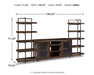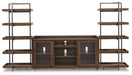 | Details | Includes TV stand and 2 etagere-style piers, Made of acacia veneers, wood, engineered wood and metal, Oiled walnut-tone finish, Dark bronze-tone metal hardware, TV stand with 2 glass-front cabinets, each with an adjustable shelf, adjustable/removable center shelf, open cubby and cutouts for wire management, Pair of metal-frame piers, each with 5 fixed shelves, Compatible with W100-02 and W100-101 electric fireplace inserts (sold separately), Assembly required | |