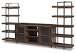For fans of urban industrial design, this 3-piece entertainment center clearly steals the show. Its blend of acacia veneer and wood is beautified with an oiled walnut-tone finish for a highly contemporary aesthetic with grainy, earthy character. Infusion of dark bronze-tone metal takes the cool character to another level. While the look might be richly substantial, open-concept piers and glass-front cabinets lighten the mood. And for your added viewing pleasure, this entertainment center is compatible with our electric fireplace inserts (sold separately).