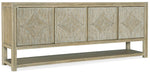 Inspired by laid-back California coast, the Surfrider Entertainment Console exudes character with four diamond-motif reeded front doors with soft-close hinges and touch latches. Crafted of Pecan Veneers with a Solid Wood edge top, the console has one adjustable vented wood shelf behind each pair of doors, a ventilated back panel and one 3-plug electrical outlet. The light natural finish is Driftwood, featuring distressing including sandblasting and bleaching.