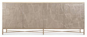 Bring a touch of "quiet luxury" to your home with the Westwood Credenza. The Polished Limestone finish on quartered oak veneers, paired with Venetian Dawn silver-leaf décor on the door fronts, creates a captivating blend of texture and color. This credenza features four doors with touch latches, each hiding an adjustable shelf and two drawers. A ventilated back panel and wire management cutouts make it ideal for entertainment purposes, while the metal base with an X-shaped stretcher adds a sleek, modern finish to the overall design.