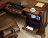 • Right Pedestal Return: One door with one adjustable shelf and one pullout tray for printer behind, center drawer with drop-front for use with a computer, one utility drawer with partitioned storage tray, all drawers on steel ball bearing drawer slides, pullout writing shelf, wire access grommets, levelers