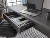 Love an urban farmhouse aesthetic? Make it work to your advantage with this beautifully styled desk. This simply striking choice in home office furniture has an unmistakable farmhouse feel thanks to design elements including a gray decorative wood grain laminate contrasted with crossbuck rails, metal accents and a stretcher in black. Perfect for office supplies, the desk includes a handy center drawer with hardware-less aesthetic to help keep your desk top clutter free