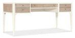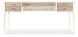Contrasting a serene Almond White finish with Figured Maple Veneers on the top, drawer fronts and sides, the Hera Writing Desk has a classic silhouette and is loaded with function. There are 5 drawers and a removable/interchangeable writing surface and pencil tray that can be used on either side top drawer. Each of the top drawers has two removable partitions. The center drawer has a drop-front writing surface with wire management. Two bottom utility drawers. The matched veneer top is striking. Small gold metal pulls.