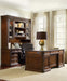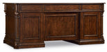 Create an inspiring workspace with the stunning Leesburg Executive Desk with a fashionable flair and classic design details like column motifs and decorative Swirl Mahogany and Ebony Veneers. The light distressing takes traditional style to a more casual and inviting place. The center drawer has a drop-front for keyboard use, and there are 3 utility drawers, two box drawers with dividers and removable pencil tray and mouse pad, along with two locking file drawers with Pendaflex letter/legal filing system. One door with one adjustable shelf and one pullout printer tray behind.
