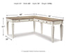 Elevating the art of traditional cottage styling, this L-shaped desk is your heavenly home office realized. Its two-tone finish combines chipped white with distressed wood tone tops for added charm. Framed drawer fronts, decorative corbels and elegantly turned and tapered legs add refinement, while dark bronze-tone knobs lend a classic touch.