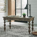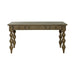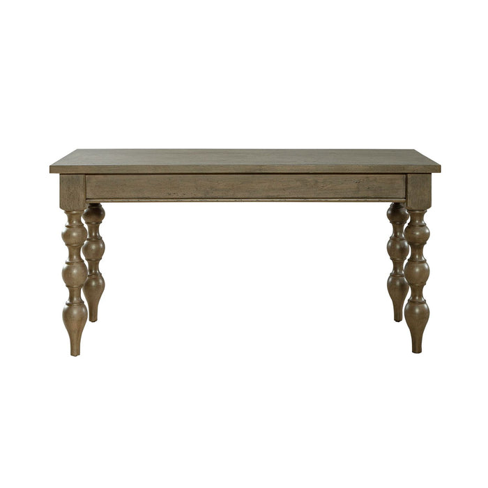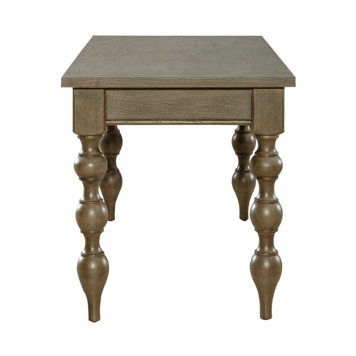 Be distinctively different with Americana Farmhouse leg desk. Heavy turned legs add a sculptural design element that will set your room apart. Features three full extension drawers with bead molding, finished in a distressed dusty taupe with antiqued brass knob pull hardware. Show off your craftsman's flair with the Americana Farmhouse writing desk.