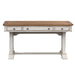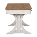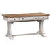 Work from home or the office in comfort and style with the Farmhouse Reimagined writing desk. Crafted of pine solids with hickory and pine veneers, this desk features a two toned antique white finish with a chestnut top. This piece has three full extension drawers with chamfered drawer fronts that are accented with antique brass knob hardware, all anchored by a unique trestle style base. Farmhouse Reimagined offers cottage styles you love in a heavily distressed finish that will work from the beach to the mountains to an industrial loft.