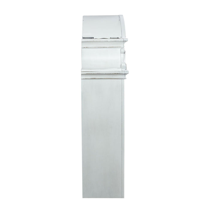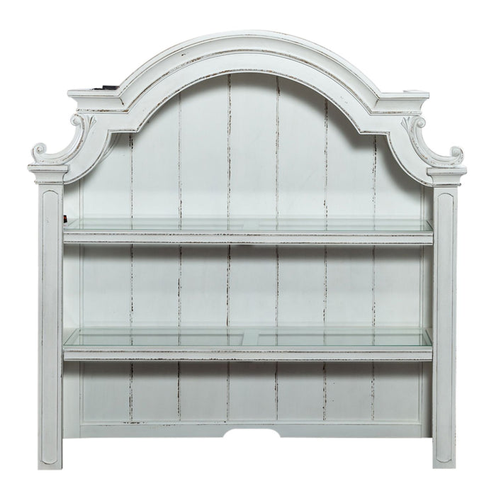 It’s never been easier to be elegant with the Magnolia Manor credenza hutch. Crafted of poplar and rubberwood solids with white oak and birch veneers, this piece features an antique white finish with heavy chipping and distressing. The hutch features arched crown molding, dog bone accents, bead molding, planked back panel, and two wood framed glass adjustable shelves. Pair this piece with the Magnolia Manor credenza as it cannot stand alone. Blending of European influences makes Magnolia Manor a truly unique style for any home.