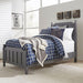 Fall into the cottage view panel bed at night. Crafted of melamine and a rubberwood solid frame, this piece features a dark gray finish, a square post bed with round finials and slat overlays, anchored by bun feet. Never question the reliability of this bed with the hook on rails and center supported slat system. This piece is offered in an alternative finish, sure to complement any space effortlessly.