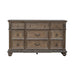 Indulge in luxury with the Carlisle Court nine drawer dresser. Crafted with excellence using rubberwood solids and rustic hickory veneers, this dresser features a Chestnut with Gray Dusty Wax finish. Breakfront styling and carved corbels accent the fluted pilasters. The base features acanthus leaf carvings and square turned bun feet. There are nine full extension drawers for optimal storage. The drawer fronts are wood framed and feature bead molding for added dimension and are accented with Antique Brass knob, drop ring, and bail hardware. The top drawers are felt lined, and the bottom drawers are lined with cedar. Combine the grand feel of the past with today’s luxurious lifestyle with the Carlisle Court nine drawer dresser.