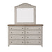 Warm and cozy. Bring beauty indoors with the Farmhouse Reimagined queen poster bed, dresser, mirror, and nightstand. Crafted of pine solids with hickory and pine veneers, this kit features an antique white finish with heavy wire brush distressing and chestnut tops, bead molding, softly rounded pilasters, full extension drawers with chamfered drawer fronts, felt lined top drawers and cedar lined bottom drawers, and is accented with antique brass knob hardware. The poster bed features shaped posts with turned finials and high-low veneer panels. The dresser has eight drawers and pairs well with the scalloped shaped beveled mirror that is anchored by bolt-on supports. Place the three drawer nightstand next to your bed and enjoy the convenience of the built in charging station, complete with two electrical outlets and two USB ports. Farmhouse Reimagined offers cottage styles that you love in a heavily distressed finish that will work from the beach to the mountains to an industrial loft.