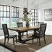 A “classic” vintage style uncompromised describes the Harvest Home five-piece trestle table set. Crafted of rubberwood solids and knotty white oak veneers, this kit features a chalkboard finish, and is complete with the trestle table and four slat back side chairs. The trestle table features a thick butcher block planked top with a solid wood edge, a 20” self-storing leaf, and a two-tone finish. The slat back side chairs have a saddle shaped seat for added comfort, and nylon chair glides to protect your flooring.