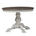Create a grand gathering with the Magnolia Manor optional five-piece pedestal table set, consisting of four splat back upholstered side chairs and a pedestal table. Crafted of poplar solids with cathedral white oak veneer, this kit features an antique white finish with heavy chipping and a weathered brown top with whitewash. The table offers one 12” leaf to accommodate guests or a larger family and is anchored by a turned pedestal base. The chairs feature the perfect blend of European design, upholstery in ivory tweed chenille, dog bone accents on the splat back, tufted back panel, nylon chair glides to protect your flooring, and beautifully faceted turned legs. Warm antique finishes and artistic distressing along with grand scale create a piece to be passed to generations.