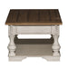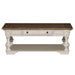 Enjoy a game night with friends around the Morgan Creek cocktail table. Crafted of poplar solids with pine and birch veneers, this piece features an antique white finish with spatter and watermark accents with a wire brushed tobacco planked top, appealing pewter nail head corner accents, one full extension drawer and a bottom shelf for additional storage, casters for easy moveability, anchored by round turned legs flowing into bracket feet. This warm and luxurious cocktail table would make a great addition to any traditional home.