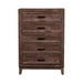 Enhance any room with this urban styled chest. This piece features bottom case dust proofing and picture framed drawer fronts. This piece is softened by the canted molding and anchored by a tapered leg base. The antique brass hardware compliments the cobblestone finish effortlessly and is sure to add dimension to your room.