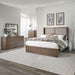 A masterpiece of modern design, the South Bend queen shelter bed, dresser, mirror, and chest combines clean lines with subtle detailing for a contemporary aesthetic. Meticulously crafted using Rubberwood solids and Small Split Heart Cathedral White Oak veneers, this set features a Burnished Clay finish. The bed boasts softly rounded shelter end panels, adding a touch of architectural finesse to your space. There are two upholstered panels on the headboard adorned in Textured Gravel upholstery, offering a subtle yet captivating visual texture. The Textured Gravel fabric not only adds a layer of tactile luxury but also complements a variety of interior styles, from modern to transitional. With its generous proportions and plush padding, the South Bend queen shelter bed provides a cozy backdrop for relaxation and indulgence. Crafted with precision and attention to detail, the dresser and chest boasts flat-cut drawer fronts that exude a sense of timeless simplicity. The top drawers are luxuriously lined with premium felt, providing a gentle touch for delicate items and adding a touch of opulence to your storage space. Meanwhile, the bottom drawers feature a cedar-lined panel, offering a natural and aromatic environment to keep your garments fresh. Accentuating the cases minimalist charm are Satin Pewter bar pull hardware, adding a hint of understated glamour to each drawer front. These sleek and stylish pulls perfectly complement the case’s contemporary design, enhancing its visual appeal. But the allure doesn't stop at the aesthetic appeal – they are also designed for practicality and convenience. All drawers operate on soft-closing drawer guides, ensuring smooth and quiet functionality while preventing slamming for a serene bedroom environment. The mirror boasts a 1-inch beveled edge, providing a classic yet contemporary aesthetic that beautifully frames your reflection. The beveled edge adds depth and dimension to the mirror, creating visual interest and elevating the overall look of your room. Use the included bolt on supports to attach the mirror to the 6 drawer dresser. Upgrade your space with the South Bend queen shelter bed, dresser, mirror, and chest, a sophisticated and stylish solution that reflects your impeccable taste and enhances the beauty of your surroundings.