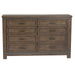 Indulge in a casual, yet contemporary look with this Thornwood Hills 8-drawer dresser. The rock beaten gray finish is accented by saw cut distressing, hammered metal strips across the top and bottom drawers, and hand hammered dark pewter hardware. Organize your clothing with the 8 full extension drawers, where the bottom drawers are equipped with dust proofing to protect your belongings.