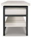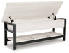 Seating with style and storage—what more could you need? This storage bench has a hinged seat and plank shelf, making it the perfect multi-use piece. The white wood grain effect lends a casual touch, while the black finished legs and supports create a dynamic contrast.