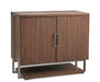 The Brooke Cabinet features slick, modern styling with mid-century elements. Inset brushed metal frames and supports the brown knotty wood, two door cabinet above the lower exterior shelf. The doors open with brushed metal bar pulls revealing two adjustable shelves, stemware and bottle storage.