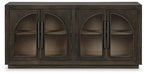 | Details | Made with solid wood and veneer, Inset wood base, Two-tone finish (dark grayish brown with light wire brush effect, lighter finish on interior), Inset wood base, Door fronts with arched glass panels, Dark pewter-tone door pulls, 4 doors, 2 shelves, Openings in back for electronics | |