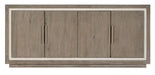 With crisp lines, a calming palette and organic texture, the Serenity Media Storage Cabinet is crafted of Oak Veneers with wire brushing. The Malibu gray washed finish is accented by a textured light gray finish in a thin border around the case, and light champagne bar pulls add a modern touch. The cabinet has 4 doors with soft close hinges with one drawer behind each pair of doors and one adjustable shelf behind each pair of doors. There’s a ventilated back panel with wire access and a power supply. Accommodates up to a 75-inch TV.
