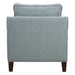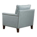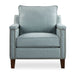 Supportive comfort in a transitional club chair, with a subtle woven argyle pattern in light sea mist, accented with antique brass nail head trim on solid oak legs finished in dark walnut.