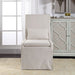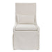 Simplistic in form, this casually sophisticated armless chair features a tailored off-white linen blend slipcover with a plush cushion seat and kidney pillow for added comfort, with added performance treatment to resist soiling and stains.
