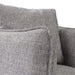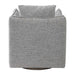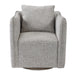 Casual shelter arm accent chair tailored in a woven linen blend fabric in natural stone hues of gray, tan and ivory. Features a flanged edge trim complete with a loose back pillow. Rests on a solid birch wood swivel base, finished in a weathered gray stain.