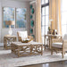 High supportive back and curvy flair arms make a grand style statement in a lightly glazed and bleached sandstone exposed hardwood finish with cane sides, tailored in a durable yet lush off-white fabric with added performance treatment to resist soiling and stains.