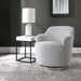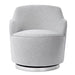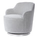Casual accent chair tailored in a woven linen blend fabric in natural stone hues. Rests on a stainless steel swivel base, finished in polished nickel.