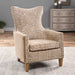 Styled with an exotic high back and curved rear legs, this chair features plush stripes in light, airy neutrals on the seat, surrounded by a coordinating solid on the back. Double row nail head detail and weathered maple wood finish.