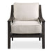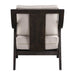 A casual combination with a modern take, this open back accent chair features a dramatically curved rustic hardwood frame with exposed grain under a rich walnut finish. Welt trimmed comfortable box cushions are a neutral beige linen blended fabric.