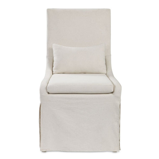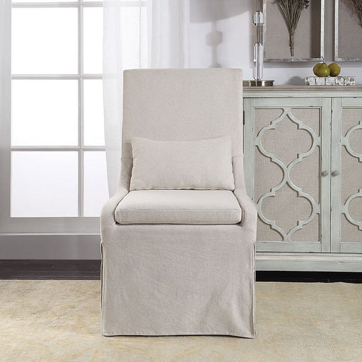 UttermostSimplistic in form, this casually sophisticated armless chair features a tailored off-white linen blend slipcover with a plush cushion seat and kid...