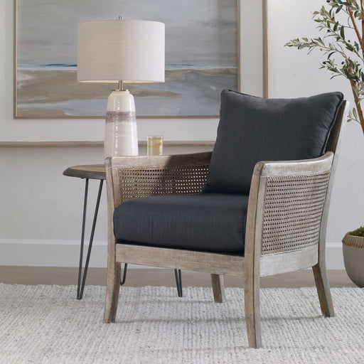 UttermostHigh supportive back and curvy flair arms make a grand style statement in a lightly glazed and bleached sandstone exposed hardwood finish with cane...