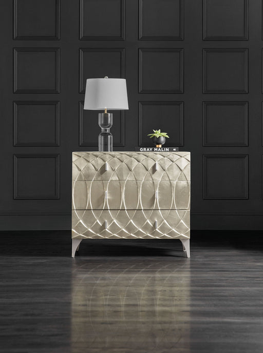 Hooker FurnishingsThe Eleana Three Drawer Chest showcases a refined design with Light Caramel walnut veneers, plated Sunlit Bronze hardware, and beige grass-cloth dr...