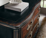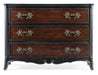 Majestic, graceful and distinctive, the Charleston Three-Drawer Accent Chest has a serpentine-shaped front, handpainted accents on the shaped bottom apron and dramatic decorative pulls in a carved leaf motif and finished in an antique bronze color. Crafted of Cherry Veneers and Resin with a Solid-Wood edge top, it has a two-tone finish pairing the vibrant Black Cherry patina with the rich Maraschino Cherry on the drawer fronts.