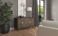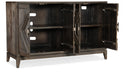 The Commerce & Market Carved Chest combines a tactile and rustic case in Mango Wood and hammered pewter hardware with a classic raised diamond pattern motif on the four doors. There’s one fixed wood shelf behind each pair of doors. Ventilated back panel.