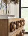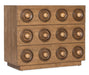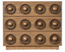 With a chic Bohemian flair, the Knobby 3-Drawer Accent Chest has round contrasting dark wood backplates and large round wood knobs across each of the three drawers. Crafted of White Oak in a light wood finish, it has a plinth base.