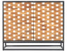 The organic chic Weaver Chest contrasts a natural Mango and bone-colored weave on the door fronts. Featuring a tribal flair, the exterior case has a black rustic finish complemented by a black iron base. Behind the doors is one adjustable wood shelf. 36 inches wide.